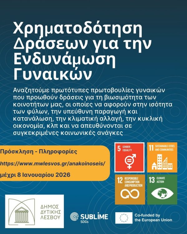 Ο Δήμος Δυτικής Λέσβου, στο πλαίσιο του ευρωπαϊκού έργου SUBLIME SDGs, καλεί τοπικούς φορείς και ομάδες να σχεδιάσουν και να υλοποιήσουν πρωτοβουλίες που ενημερώνουν και ευαισθητοποιούν την κοινότητα και προωθούν βιώσιμες πρακτικές, αναδεικνύοντας παράλληλα τον κεντρικό ρόλο των γυναικών στην επίτευξη της Βιώσιμης Ανάπτυξης. Από τις προτάσεις που θα υποβληθούν, θα επιλεγούν δύο για χρηματοδότηση έως και 9.270 ευρώ η […]