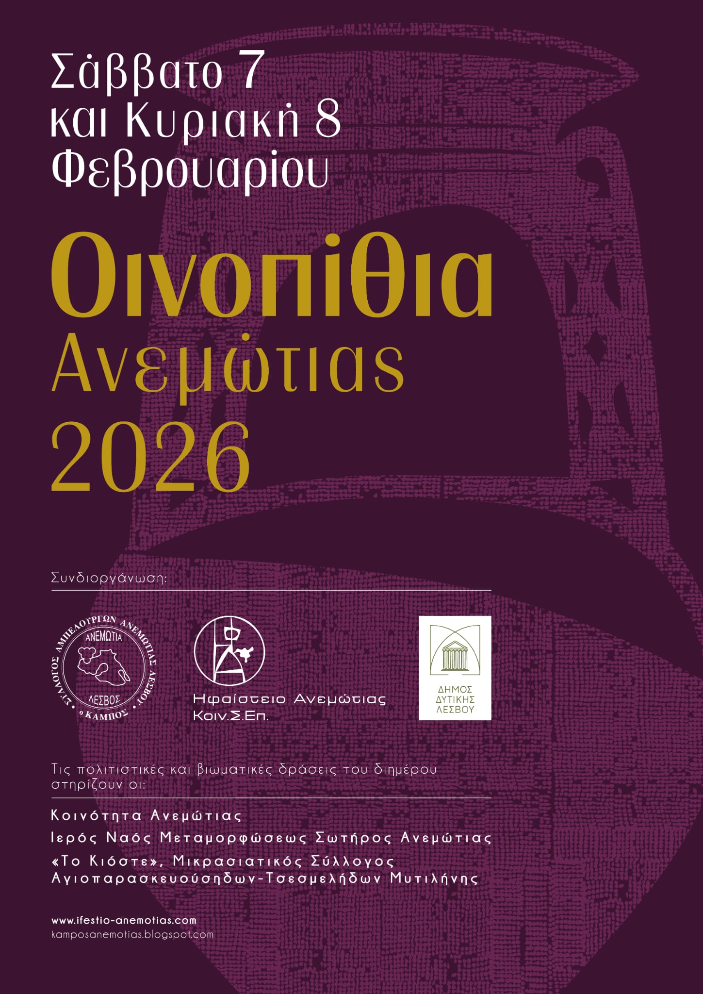 Ο Σύλλογος Αμπελουργών Ανεμώτιας Λέσβου «ο Κάμπος» και η Κοιν.Σ.Επ. «Ηφαίστειο Ανεμώτιας» με την υποστήριξη του Δήμου Δυτικής Λέσβου και του Μικρασιατικού Συλλόγου Αγιοπαρασκευούσηδων – Τσεσμελήδων Μυτιλήνης «Το Κιόστε», διοργανώνουν τα “Οινοπίθια Ανεμώτιας 2026», στις 7 & 8 Φεβρουαρίου 2026 στις συνεταιριστικές εγκαταστάσεις του Οινοποιείου της Βρυσάρας. Τα «Οινοπίθια Ανεμώτιας» αντλούν το όνομά τους από […]