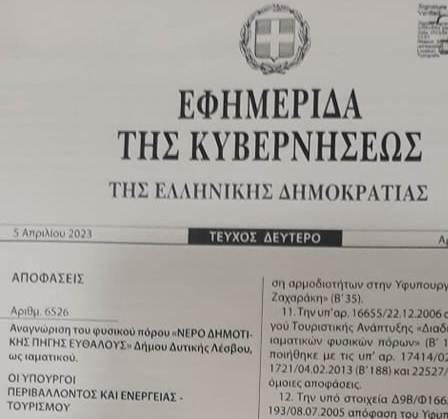 Στο πλαίσιο της επίπονης και πολυδαίδαλης προσπάθειας που ξεκίνησε από την πρώτη ημέρα της θητείας της η δημοτική αρχή για την ανάκτηση των δικαιωμάτων και την αναγνώριση του φυσικού πόρου στις τρεις ιαματικές πηγές της Δυτικής Λέσβου, εξασφαλίστηκε χθες η σχετική πιστοποίηση και της περίπτωσης της πηγής της Εφταλούς.