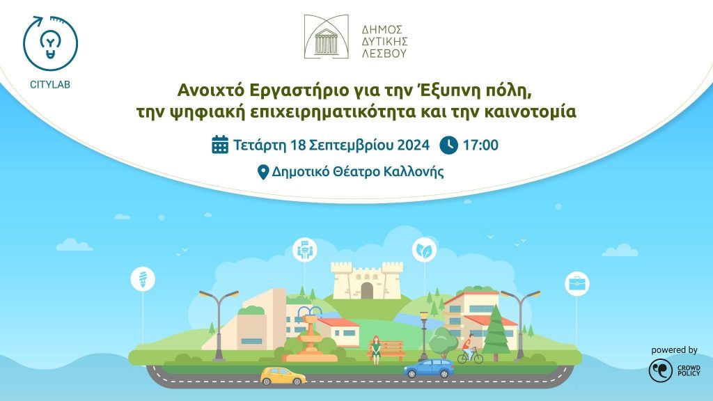 Ο Δήμος Δυτικής Λέσβου σε συνεργασία με την εταιρεία καινοτομίας και τεχνολογίας Crowdpolicy, διοργανώνει την Τετάρτη 18 Σεπτεμβρίου 2024 και ώρα 17:00, στο Δημοτικό Θέατρο Καλλονής, Ανοιχτό Εργαστήριο με θέμα: Ψηφιακή Μετάβαση, Τεχνητή Νοημοσύνη και Επιχειρηματικότητα στην τοπική κοινωνία.