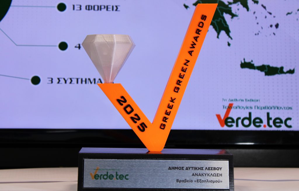 • Το Βραβείο «Εξοπλισμού» στην Ανακύκλωση έλαβε η καλή πρακτική των «Έξυπνων Κάδων» του Δήμου Δυτικής Λέσβου στα GREEN GREEK AWARDS 2025, κατά την 7η Διεθνή Έκθεση VERDE.TEC που πραγματοποιήθηκε στην Παιανία. Το έργο υλοποιήθηκε σε συνεργασία με το Τμήμα Πολιτισμικής Τεχνολογίας του Πανεπιστημίου Αιγαίου.