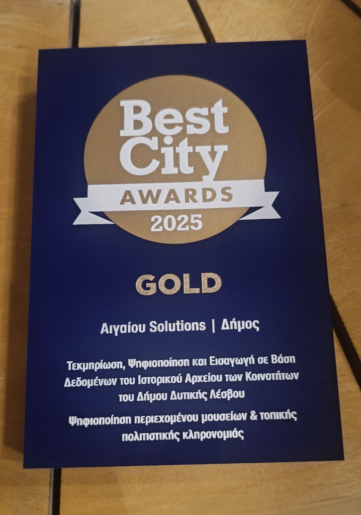 Στα «Best City Awards 2025», o Δήμος βραβεύτηκε με το χρυσό στην κατηγορία «Ψηφιοποίηση Μουσείων και τοπικής πολιτιστικής κληρονομιάς»για το έργο με τίτλο: «Τεκμηρίωση, Ψηφιοποίηση και Εισαγωγή σε Βάση δεδομένων του Ιστορικού Αρχείου των Κοινοτήτων του Δήμου Δυτικής Λέσβου», μαζί με την Εταιρία «Aegean Solutions» που υλοποίησε το έργο.
