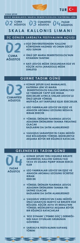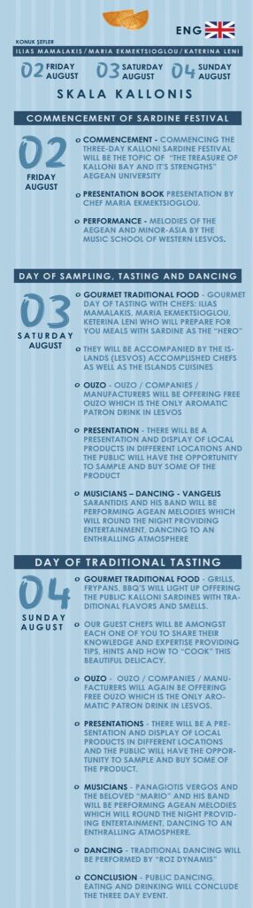 –Τηγάνια και ψησταριές θα “πάρουν φωτιά” για να κεράσουν σαρδέλα Καλλονής με άρωμα παράδοσης. Οι guest chef μας θα γίνουν ένα με τις νοικοκυρές μας και τους ψήστες μας και θα μοιράζουν γευστικές σαρδέλες!