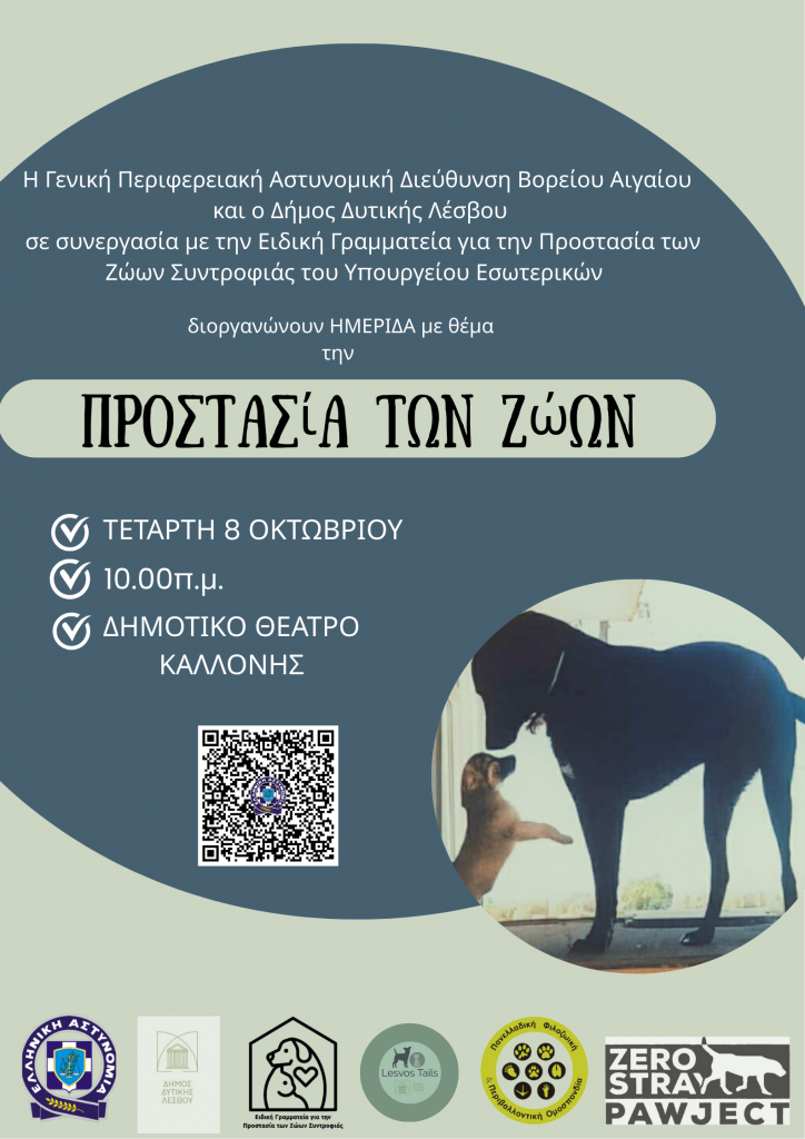 Η Γενική Περιφερειακή Αστυνομική Διεύθυνση Βορείου Αιγαίου και ο Δήμος Δυτικής Λέσβου και σε συνεργασία με την Ειδική Γραμματεία για την Προστασία των Ζώων Συντροφιάς του Υπουργείου Εσωτερικών, διοργανώνουν την Τετάρτη 8 Οκτωβρίου και ώρα 10:00π.μ. στο Δημοτικό Θέατρο Καλλονής ΗΜΕΡΙΔΑ με κεντρικό θέμα την «Προστασία των Ζώων».