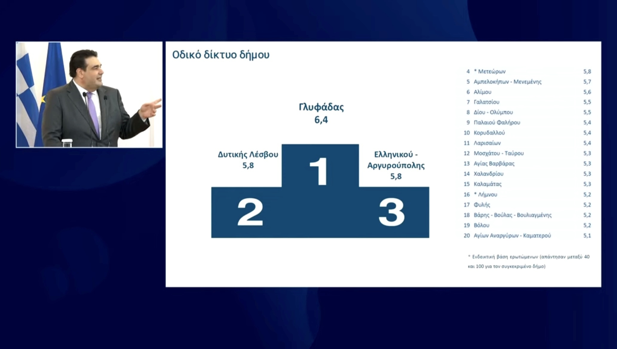Στην εκδήλωση που γίνεται αυτή την ώρα στο Μέγαρο Μαξίμου, παρουσία και του Πρωθυπουργού Κυριάκου Μητσοτάκη, ο Υπουργός Εσωτερικών παρουσίασε αναλυτικά και ανά τομέα τις επιδόσεις των δήμων της χώρας και είναι αξιοσημείωτο πως πέραν της δεύτερης μεγαλύτερης βαθμολογίας στο οδικό δίκτυο, (πίσω μάλιστα από έναν Δήμο «κολοσσό» όπως είναι ο Δήμος Γλυφάδας), ο μικρός, νεοϊδρυθείς και νησιωτικός Δήμος Δυτικής Λέσβου, έλαβε άλλες επτά -και διόλου ευκαταφρόνητες διακρίσεις- και σε άλλους τομείς.