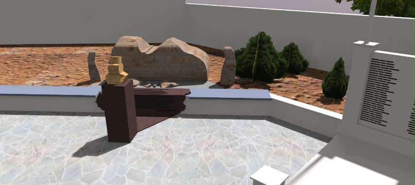 Η σύνθεση του γλυπτικού συνόλου, δίπλα στο μνημείο πεσόντων, και η ελαφρά προς δυσμάς στροφή του βάθρου οδηγούν το βλέμμα του ήρωα προς την ανηφόρα του Καρδώνα, την κατοικία Κουβελίδη και το πρατήριο καυσίμων του πατρός του, αμέσως μετά το ξενοδοχείο. Το βάθρο από Ιγνιμβρίτη, σε συνδυασμό με το τοπικό λευκό βράχο του Πολυχνίτου, δημιουργεί μια ισχυρή μνημονική παρουσία• σκιές λιθίνες Ιγνιμβρίτη απλώνονται προς το πίσω μέρος του βάθρου, προοπτικά αναρριχούμενες στο κράσπεδο του κήπου — καμπιλωτά ακανόνιστες, ως το «εκρέον αίμα» που φέρει ανάγλυφα ο καβαφικός στίχος — προκειμένου να συνδεθούν με τον επανατοποθετημένο τοπικό λευκό βράχο Ιγνιμβρίτη του Πολυχνίτου. Το εξαιρετικό τεμάχιο λευκής κίσσηρης, μεγαλοπρεπές στην τυχαία τομή του, φέρει έναν διακριτικό σπειροειδή σχηματισμό πορφυρού ιζήματος, στην παλμικότητα της καρδιάς του ήρωα τη στιγμή του πυροβολισμού.