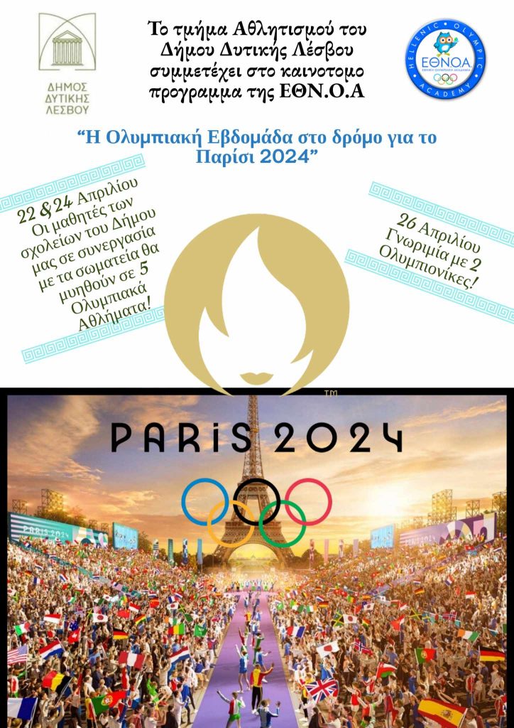 Ο Δήμος Δυτικής Λέσβου, συμμετέχοντας στο Πρόγραμμα της Εθνικής Ολυμπιακής Ακαδημίας (ΕΘΝΟΑ) και ειδικότερα στο εκπαιδευτικό πρόγραμμα «Ολυμπιακή Παιδεία στα σχολεία», υλοποιεί τη δράση «Ολυμπιακή Εβδομάδα στο δρόμο για το Παρίσι 2024», πραγματοποιώντας σήμερα με τη συμμετοχή μαθητών σχολείων και αθλητικών σωματείων της Δυτικής Λέσβου την τελετή έναρξης στο Δημοτικό Στάδιο Καλλονής «Κώστας Κεντέρης».