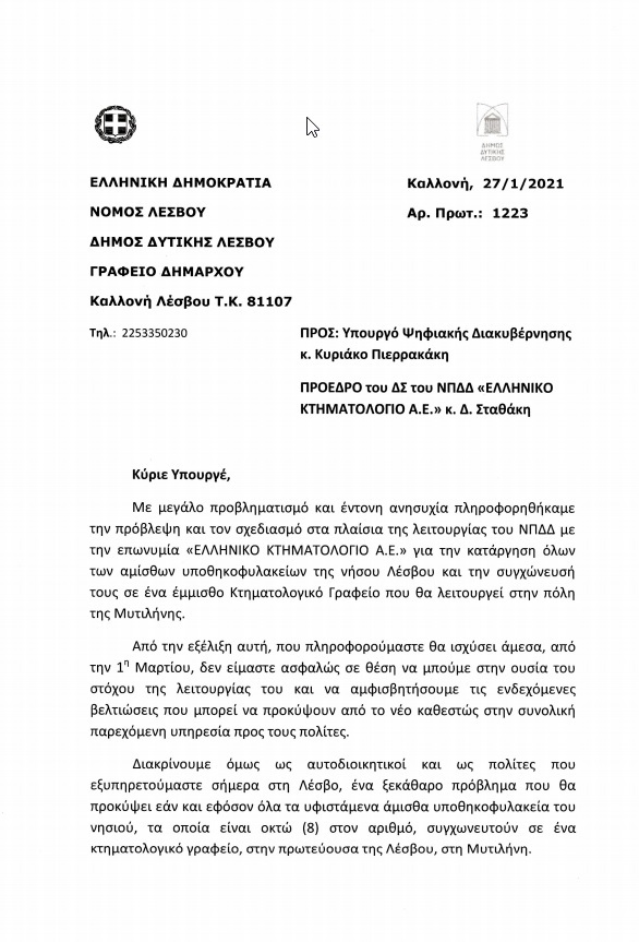 Με κοινή τους παρέμβαση στον Υπουργό Ψηφιακής Διακυβέρνησης Κυριάκο Πιερρακάκη και στον Πρόεδρο του ΔΣ του ΝΠΔΔ «ΕΛΛΗΝΙΚΟ ΚΤΗΜΑΤΟΛΟΓΙΟ Α.Ε.» κ. Σταθάκη, ο Δήμαρχος Δυτικής Λέσβου Ταξιάρχης Βέρρος και ο Περιφερειακός Σύμβουλος Βορείου Αιγαίου Στρατής Κυρατζής ζητούν ενόψει της Απόφασης της κυβέρνησης να προχωρήσει στην κατάργηση των αμίσθων υποθηκοφυλακείων στη Λέσβο (σ.σ. και την συγχώνευσή τους σε ένα έμμισθο Κτηματολογικό Γραφείο με έδρα τη Μυτιλήνη) κατ΄ ελάχιστο την πρόβλεψη να συσταθεί τουλάχιστον ένα Κτηματολογικό Γραφείο και στα όρια του Δήμου Δυτικής Λέσβου. Ιδανικά, προτείνουν την μετατροπή του άμισθου Υποθηκοφυλακείου της Καλλονής σε Κτηματολογικό Γραφείο του Δήμου Δυτικής Λέσβου.