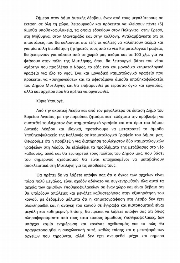 Και συνεχίζουν: «Σήμερα στον Δήμο Δυτικής Λέσβου, έναν από τους μεγαλύτερους σε έκταση σε όλη τη χώρα, λειτουργούν και πρόκειται να κλείσουν πέντε (5) άμισθα υποθηκοφυλακεία, τα οποία εδρεύουν στον Πολιχνίτο, στην Ερεσό, στη Μήθυμνα, στον Μανταμάδο και στην Καλλονή. Αντιλαμβάνεστε ότι οι αποστάσεις που θα καλούνται στο εξής οι πολίτες να καλύπτουν ακόμα και για μία απλή διευθέτηση ζητήματός τους από το νέο Κτηματολογικό Γραφείο, θα ξεπερνούν για κάποια από τα χωριά μας ακόμα και τα 100 χλμ. για να φτάσουν στην πόλη της Μυτιλήνης, όπου θα λειτουργεί βάσει του νέου «χάρτη» που προβλέπει ο Νόμος, το εξής ένα και μοναδικό κτηματολογικό γραφείο για όλο το νησί. Ένα και μοναδικό κτηματολογικό γραφείο που πρόκειται να «συγχωνεύσει» και τα υφιστάμενα άμισθα υποθηκοφυλακεία του Δήμου Μυτιλήνης και θα επιβαρυνθεί με τεράστιο όγκο και εργασίας, αλλά και αρχείου που θα πρέπει να οργανωθεί».