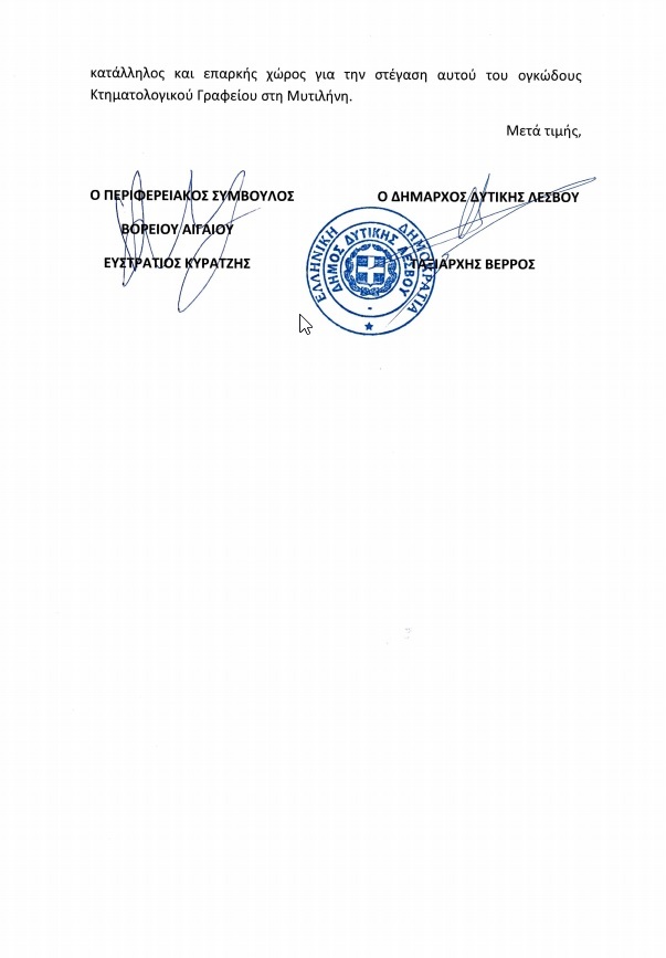 Στην επιχειρηματολογία τους για την αναγκαιότητα πρόβλεψης διατήρησης τουλάχιστον ενός ακόμη Κτηματολογικού Γραφείου, οι αυτοδιοικητικοί της Λέσβου προσθέτουν: «Από την ακριτική Λέσβο και από τον μεγαλύτερο σε έκταση Δήμο του Βορείου Αιγαίου, με την παρούσα, ζητούμε κατ΄ ελάχιστο την πρόβλεψη να συσταθεί τουλάχιστον ένα κτηματολογικό γραφείο και στα όρια του Δήμου Δυτικής Λέσβου και ιδανικά, προτείνουμε να μετατραπεί το άμισθο Υποθηκοφυλακείο της Καλλονής σε Κτηματολογικό Γραφείο του Δήμου μας. Θεωρούμε ότι η πρόβλεψη για διατήρηση τουλάχιστον δύο κτηματολογικών γραφείων στη Λέσβο, θα εξαλείψει τα προβλήματα της μετάβασης στο νέο καθεστώς, αλλά και θα εξυπηρετεί τους πολίτες του Δήμου μας, που βάσει του σημερινού σχεδιασμού θα είναι υποχρεωμένοι να μεταβαίνουν αποκλειστικά στη Μυτιλήνη για τις υποθέσεις τους.