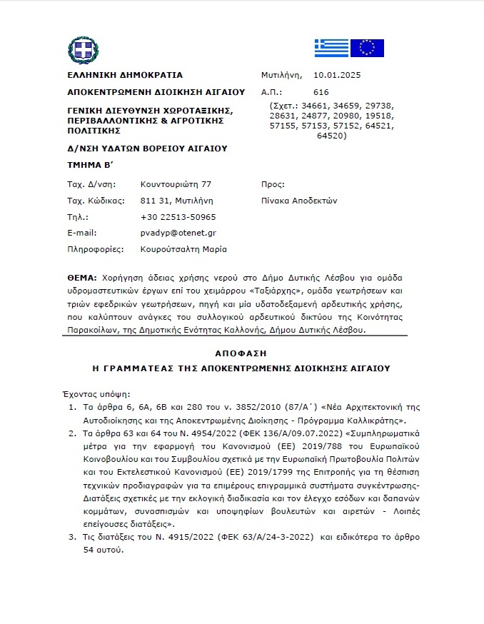 Ο Δήμαρχος Ταξιάρχης Βέρρος καθώς και η αρμόδια αντιδήμαρχος Ασανούλα Γιαννή-Κοκκινέλλη, συγχαίρουν το προσωπικό της Διεύθυνσης Περιβάλλοντος που εξασφάλισαν για τον Δήμο Δυτικής Λέσβου αυτή την ιδιαίτερα σύνθετη αδειοδότηση – από τις μεγαλύτερες που έχει εκδώσει η Διεύθυνση Υδάτων Βορείου Αιγαίου. Ενώ ευχαριστούν θερμά τον Διευθυντή και το προσωπικό της Διεύθυνσης Υδάτων Βορείου Αιγαίου της Αποκεντρωμένης Διοίκησης Αιγαίου καθώς και το προσωπικό του Τμήματος Υδροοικονομίας της Περιφέρειας Βορείου Αιγαίου, για την συνεργασία σε όλα τα στάδια της αδειοδότησης.