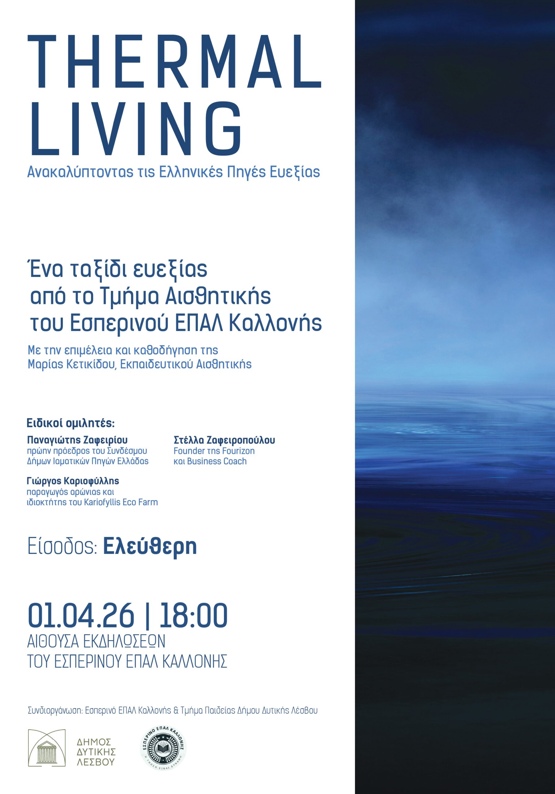 Το Εσπερινό Επαγγελματικό Λύκειο (ΕΠΑΛ) Καλλονής, σε συνεργασία με το Τμήμα Παιδείας του Δήμου Δυτικής Λέσβου, διοργανώνει εκδήλωση με τίτλο «Thermal Living – Ανακαλύπτοντας τις ελληνικές πηγές ευεξίας», η οποία θα πραγματοποιηθεί την Τετάρτη 1 Απριλίου 2026 και ώρα 18:00, στην αίθουσα εκδηλώσεων του σχολείου. Η εκδήλωση, που είναι ανοιχτή στο κοινό, υλοποιείται με την […]