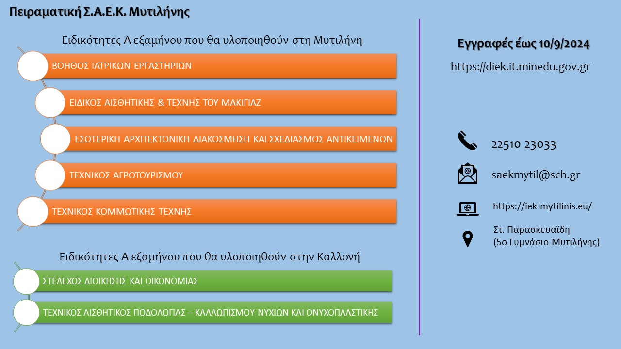 Από το ΔΙΕΚ Μυτιλήνης γίνεται γνωστό πως ξεκίνησαν οι εγγραφές και θα διαρκέσουν έως τις 10/9 για τις δύο ειδικότητες που θα λειτουργήσουν από φέτος και για πρώτη φορά στην Καλλονή και στο κτήριο του ΕΠΑΛ. Οι ενδιαφερόμενοι μπορούν να υποβάλλουν τις αιτήσεις τους για να αποκτήσουν την επαγγελματική κατάρτιση που επιθυμούν ηλεκτρονικά στο saekmytil@sch.gr […]