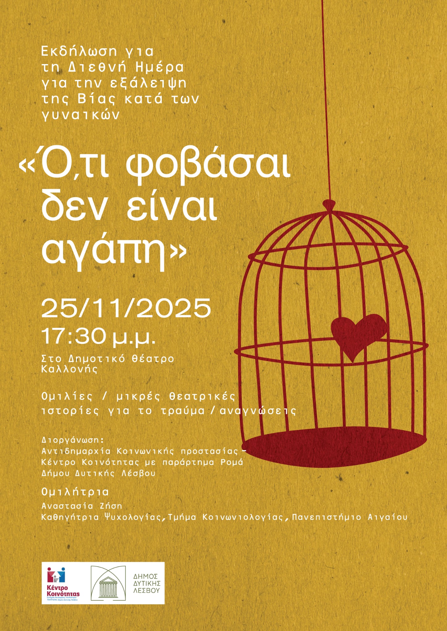 Εκδήλωση για τη Διεθνή Ημέρα Εξάλειψης της Βίας κατά των Γυναικών H Αντιδημαρχία Κοινωνικής Προστασίας και το Κέντρο Κοινότητας με Παράρτημα Ρομά του Δήμου Δυτικής Λέσβου, σας προσκαλεί σε εκδήλωση με αφορμή τη Διεθνή Ημέρα Εξάλειψης της Βίας κατά των Γυναικών. Η εκδήλωση, η οποία έχει ως κεντρικό άξονα το τραύμα και τη διαδικασία αντιμετώπισης […]