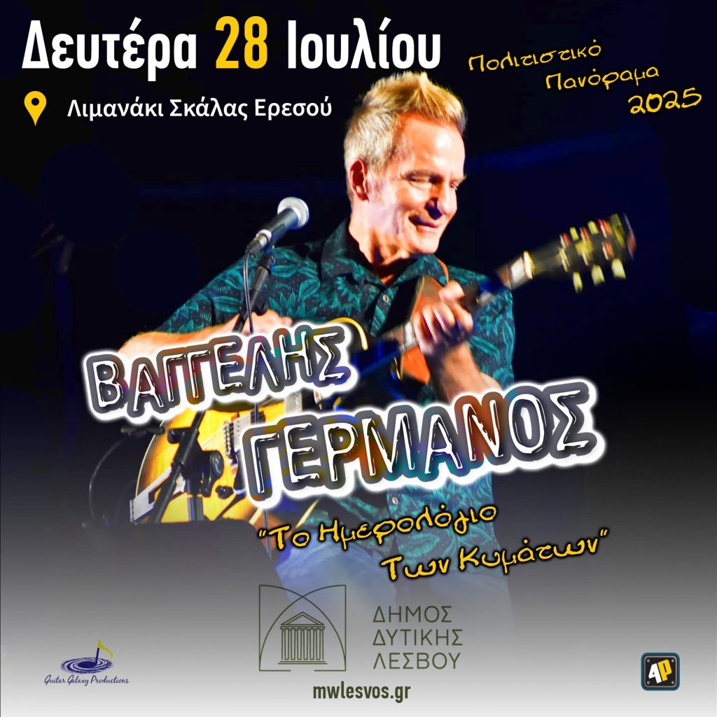 Ένας από τους πιο αναγνωρίσιμους τραγουδοποιούς της ελληνικής μουσικής σκηνής, ο Βαγγέλης Γερμανός, έρχεται τη Δευτέρα 28 Ιουλίου στη Σκάλα Ερεσού, για μια ξεχωριστή συναυλία στο λιμανάκι, στο πλαίσιο του «Πολιτιστικού Πανοράματος» του Δήμου Δυτικής Λέσβου.