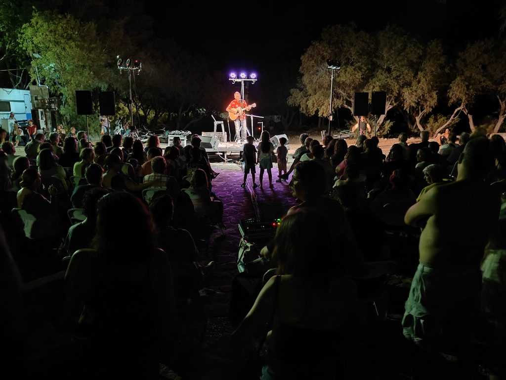 Ο αγαπημένος τραγουδοποιός, με την κιθάρα του και την χαρακτηριστική του αύρα, πήρε το πολυπληθές κοινό σε ένα μουσικό ταξίδι γεμάτο αναμνήσεις. Τα τραγούδια του — «Κηπουρός», «Απόκληρος», «Μπανιέρα», «Δραπέτης», «Βραχυκύκλωμα», «Γόησσα» και φυσικά η «Κρουαζιέρα» , τραγουδήθηκαν αυθόρμητα εν χορώ, με τον ίδιο τον καλλιτέχνη να ενθαρρύνει το κοινό να σιγοντάρει, μετατρέποντας τη συναυλία σε μια μεγάλη παρέα.